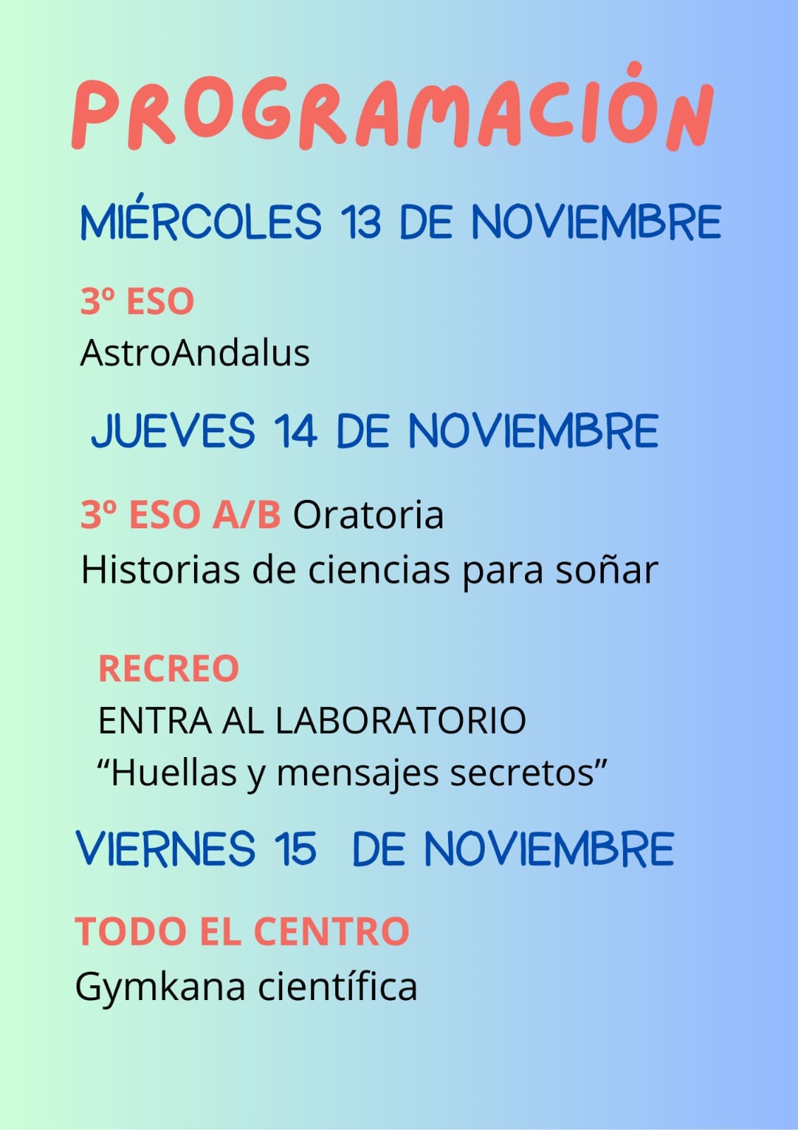 El dia 15 de noviembre el IES Sierra de la Grana se llenó de emoción con una Gymkana Científica que nos retó a pensar, resolver y aprender mientras nos divertíamos. ¡Qué gran manera de cerrar esta experiencia única para cerrar los eventos dedicados a esta IX SEMANA DE LA CIENCIA.